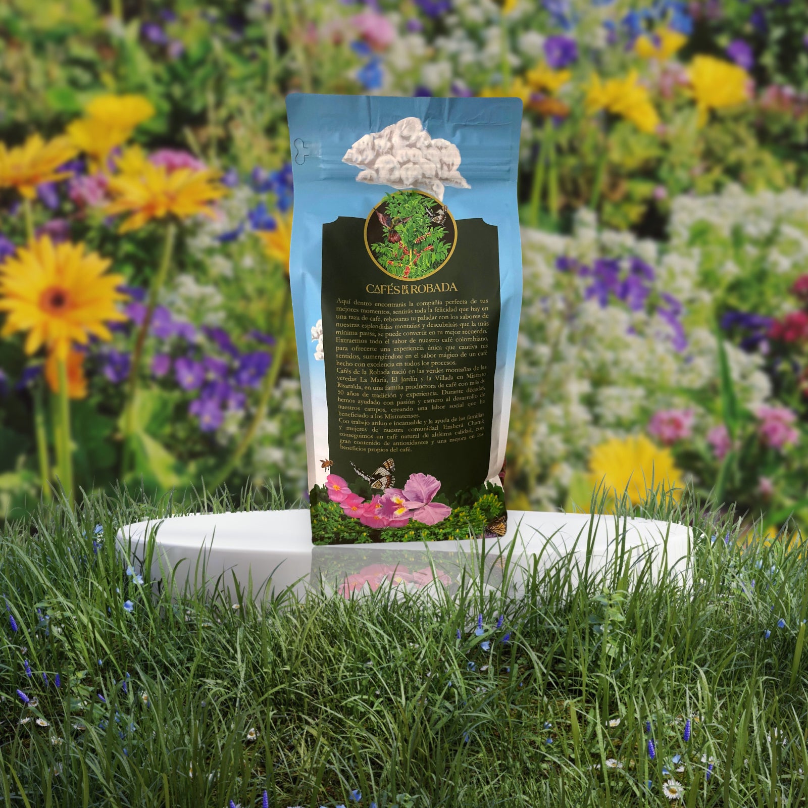 Café producido en Colombia/ Made in Colombia Para: Cafés de las Robada SAS Zomac NIT 901458751-8, Finca La Robada, vereda La María, Mistrato, Risaralda, Colombia. Notificación sanitaria: INVIMA NSA-0007850-2019, Para: Cafés de la Robada, S.L. Paseo Alameda de Osuna 50N 6A. NIF:B88445184